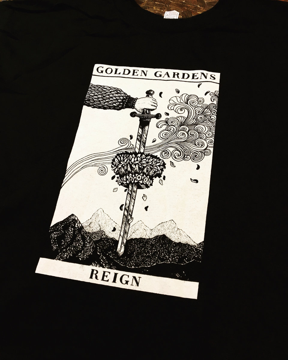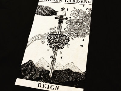 "Ace of Swords" design by Kirk Damer. White discharge ink on black Alstyle ringspun premium tee. Limited run of 48.